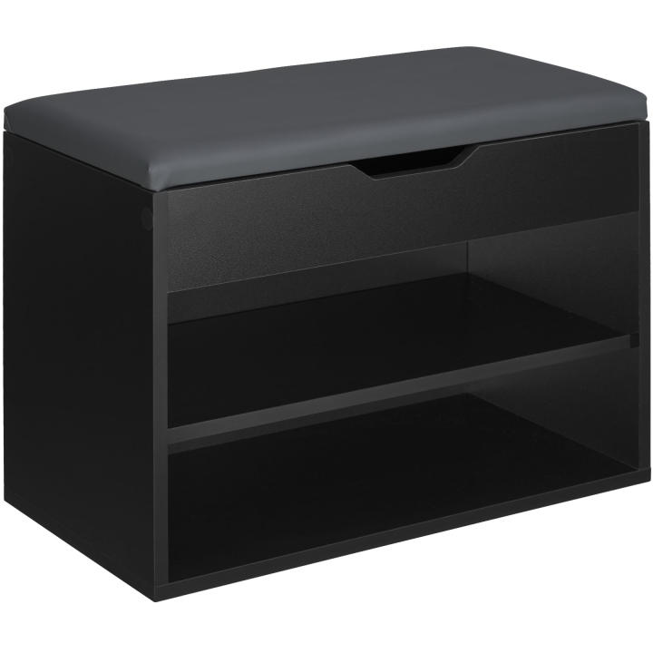 El versátil zapatero de tectake pone orden en su pasillo, pero con estilo. Hay un amplio espacio para seis pares de zapatos en los dos estantes abiertos, mientras que el compartimento superior plegable es ideal para guardar bufandas, guantes y gorros. El asiento tapizado, que se adapta perfectamente al color de la superficie del estante, garantiza la comodidad. Los robustos tableros DM y el revestimiento de melamina brindan a esta construcción tan compacta un alto nivel de estabilidad y un diseño atractivo que se puede combinar fácilmente con diferentes estilos de decoración.