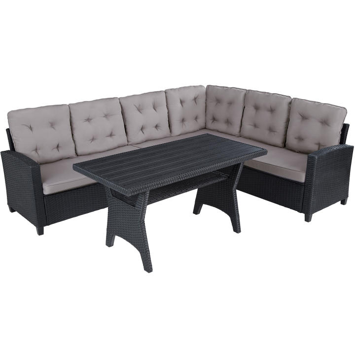 Empieza tus vacaciones en tu propio jardín con el cómodo conjunto de ratán Catania de tectake. Los suaves cojines del asiento y los gruesos cojines del respaldo proporcionan un confort óptimo. La gran mesa destaca por su aspecto de madera en la zona superior, por la estantería adicional y por los pies de plástico ajustables en altura que evitan dañar el suelo. El sólido armazón de acero y el resistente trenzado de poliratán son las características propias de este fantástico mueble: haz una barbacoa y relájate con familia y amigos en el conjunto modulable de muebles de exterior Catania de tectake.