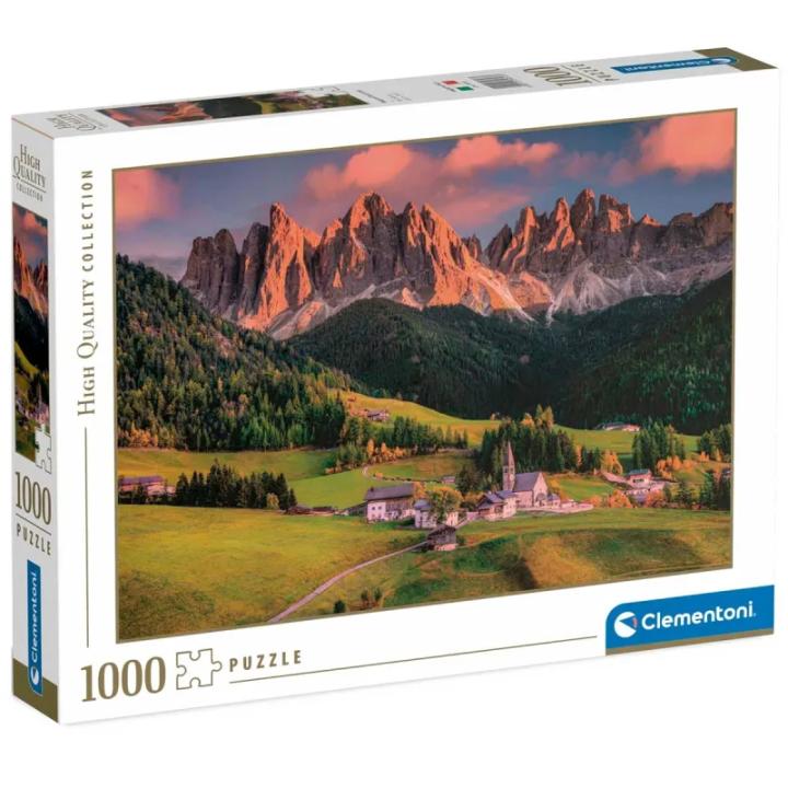 Puzzle 2000 piezas de alta calidad, Valle de Funes de Italia, es un puzle un pueblecito rodeado de montañas y en el fondo unas montañas rocosas de los Alpes, la imagen de un Valle Italiano, es ideal