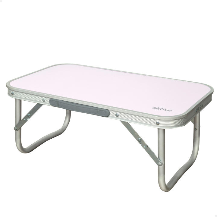 Mesa de playa o camping plegable Aktive Camping. Mide 56x34x24 cm Tablero de madera MDF y estructura de aluminio resistente, con 2 patas plegables de 19 mm de grosor. Ligera y fácil de transportar, la mesa tiene una práctica asa y pesa aproximadamente 1 Kg. Ocupa poco espacio plegada y es ideal para comer en la playa, para los niños o como mesa baja auxiliar.