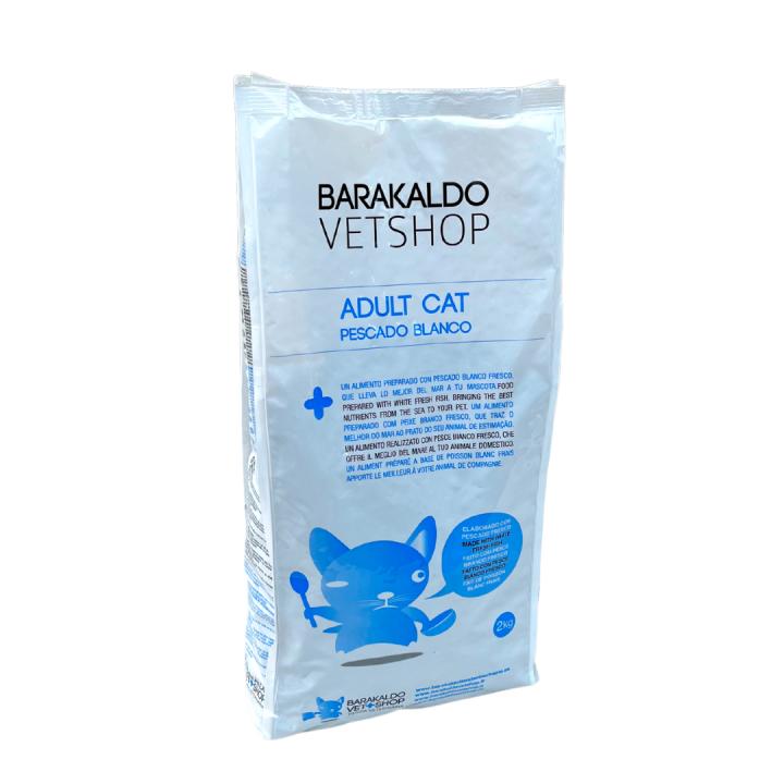 Alimento Gatos Adultos con Pescado Blanco Barakaldo Vet ShopAlimento completo para gatos adultos preparado con pescado blanco fresco, que lleva lo mejor del mar a tu mascota.CARACTERÍSTICAS:Omega 3 y Omega 6: Protege al sistema inmunológico y ayuda a desarrollar la salud cardiovascular y el sistema nervioso.Urinary Care: La combinación de minerales y bisulfato sódico ayudan a disminuir el pH de orina y a reducir la formación de cálculos urinarios.Protección frente a alérgenos e intolerancias alimentarias: La selección de productos naturales en su fórmula le confiere la propiedad de reducir al máximo el nivel de alérgenos y los efectos indeseables relacionados con las intolerancias alimentarias. Siendo el alimento ideal para mantener una piel sana y buen estado del sistema digestivo.Piel y pelo brillante: El zinc y la vitamina A ayudan a mantener una piel y pelo sano, suave y brillante.Pescado fresco sabor irresistible: Elaborado con pescado blanco que ha superado los más altos estándares de calidad. La proteína es de la máxima calidad nutricional, siendo óptima la digestibilidad, y aportando un sabor y una apetencia excepcionales.Optima digestión: Fórmula enriquecida con prebióticos que estimulan el crecimiento de la flora intestinal mejorando la digestión y la absorción de nutrientes. Disminuyen el desarrollo de las bacterias no deseadas en el intestino.Efecto antioxidante natural: Contiene antioxidantes naturales (tocoferoles), que reducen los efectos oxidativos y retrasan el envejecimiento celular.Libre de olores: Fórmula diseñada con componentes para ayudar a reducir la intensidad del olor de las heces.COMPOSICIÓN:Pescado blanco fresco 20%. Arroz. Proteína deshidratada de pescado blanco y atún 19%. Guisantes. Gluten de maíz. Maíz. Aceite de pollo. Trigo. Levaduras. Hidrolizadoo de hígado de ave. Proteína de arroz. Proteína deshidratada de pollo. Pulpa de remolacha. Carbonato cálcico. Manzana deshidratada. Brócoli deshidratado. Zanahoria deshidratada. Achicoria 0,1% (fuente de FOS). Yuccaa schidigera.COMPONENTES ANALÍTICOS:Proteína bruta 31,20%, Grasa bruta15,75%, Fibra bruta 2,55%, Ceniza bruta 8,15 %, Calcio 1,40 %, Fósforo 1,15 %.ADITIVOS: Aditivos nutricionales: Vitamina A 18.000 UIUI/kg. Vitamina D3 1.450 UI/kg. Vitamina E 175 mg/kg. Hierro (sulfatfato de hierro (II) monohidratado) 68 mg/kg. Yodo (yoduro potásico) 3,20 mg/kg. Cobre (sulfato de cobre (II) pentahidratado) 9 mg/kg. Manganeso (sulfato manganoso monohidratado) 6,8 mg/kg. Zinc (óxido de zinc) 108 mg/kg. Selenio (selenito de sodio) 0,11 mg/kg. Taurina 970 mg/kg.Aditivos tecnológicos: Antioxidantes: Extracractos de tocoferol de aceites vegetales 770 mg/kg. Reguladores de la acidez: Bisulfato de sodio 5.000 mg/kg.MODO DE EMPLEO:El cambio de alimento debe hacerse de forrmma gradual durante 7 días. Suministre el alimento en 2 tomas al día. No aproveche las dosis sobrantes del día anterior. La cantidad de alimento puede variar en función de la actividad, raza del gato y condiciones ambientales. Los gatos deben disponer siempre de agua limpia y fresca.TABLA DE RACIONAMIENTO:Guía orientativa de alimentación (g/día)Peso del gato (kg)2 kg3 kg4 kg5 kg6 kg7 kgMantenimiento415466768696Pérdida de peso-5259646974PRESENTACIÓN:Para que tu mascota siempre coma el alimento fresco y recién abierto logrando así la máxima efectividad de sus nutrientes, lo hemos fabricado en cómodas presentaciones de 2 kg.