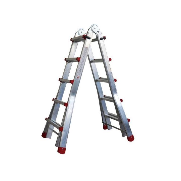 Normativa de escaleras EN-131. Fácil ajuste de altura por el dispositivo de bloqueo. Utilización en suelos desnivelados. Tacos robustos antideslizantes. Peso reducido.