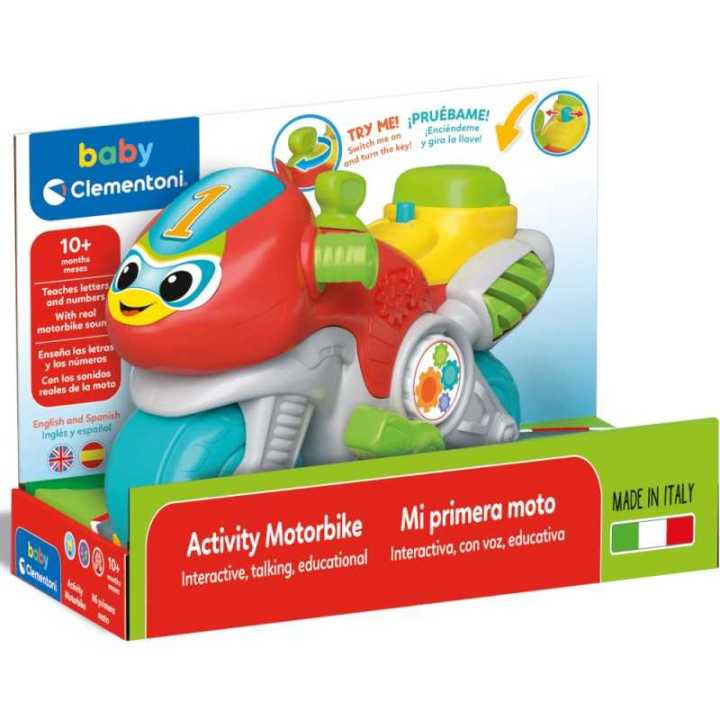 Espectacular Marcial Moto Mundial esta pequeña Motocicleta súper colorida que también es un divertido centro de actividades electrónico, que ayuda al niño/a a aprender las letras y los números gracias a los botones interactivos: el baúl se puede presionar y la llave gira.