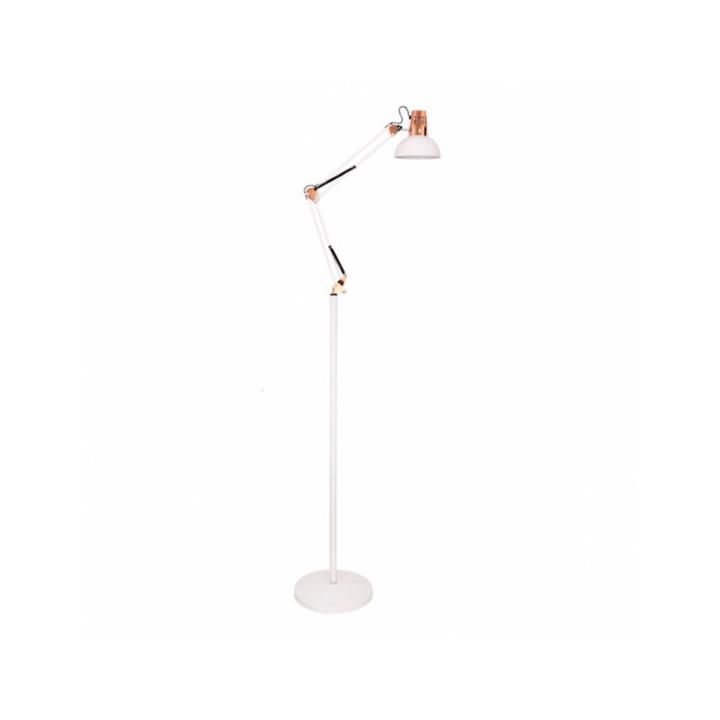 Flexo de Pie de la serie RUTILO en color BLANCO/COBRE. De diseño elegante y sencillo realizado en metal, lo que lo hace fuerte y resistente. Con pie articulado y cabeza abatible haciendo posible orientar la luz donde se requiera directa o indirectamente. Posee un portalámparas E27. Bombilla no incluida. Es ideal para despachos, estudios, salas de espera e incluso salones decorados con el nuevo estilo rústico-vintage. Muy decorativo. Tiene unas dimensiones en altura regulable de 147<,180x28x28 centímetros. Modelo también disponible en color negro/cobre, blanco/cromo, negro/cromo, plata, rojo, blanco y negro mate. Podemos encontrar también el flexo de sobremesa en esta misma serie.