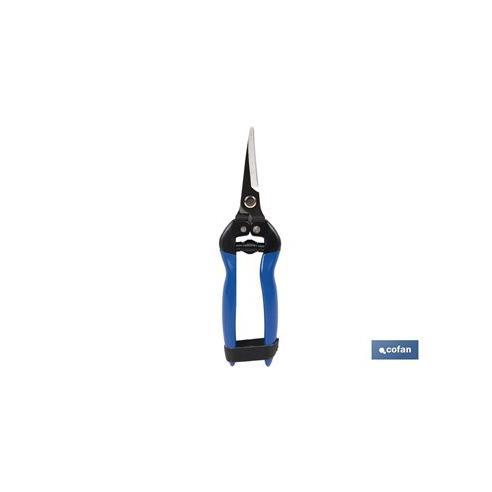 Tijeras de recolección con punta curva de 185 mm. Su hoja es de acero, el mango está bañado en PVC antideslizante y están equipadas con un sistema de cierre de seguridad. Este producto es especial para la recolección. Esta herramienta es perfecta para trabajos de acondicionamiento y limpieza en jardinería, agricultura y horticultura. Su filo afilado está totalmente capacitado para realizar tareas de carácter profesional. Su mango es cómodo y no permite el deslizamiento. Su sistema de seguridad ayuda a que las hojas se mantengan afiladas cuando las tijeras no están siendo usadas y evita cortes o lesiones por accidente.