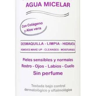 Agua micelar con colágeno y aloe vera que desmaquilla, limpia e hidrata la piel.