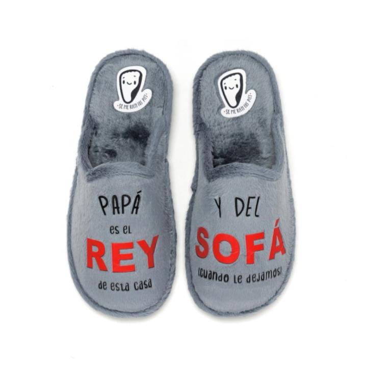 Zapatilla de casa de caballero de la marca SE ME RIEN LOS PIES modelo Papá es el rey de esta casa y del sofá cuando lo dejamos. Fabricada en tejido melocotón suabe en color azul. El forro es de tejido aterciopelado. La suela es ergonómica y antideslizante. Fabricado en España