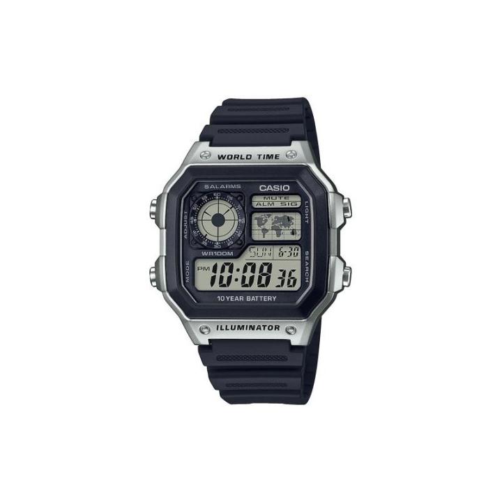 Reloj digital de la marca Casio para hombre. Caja de resina plateada y correa de goma negra con cierre de hebilla. Luz LED, zona horaria, cronómetro, temporizador, alarma y formato 12/24 horas. Presentado en estuche.