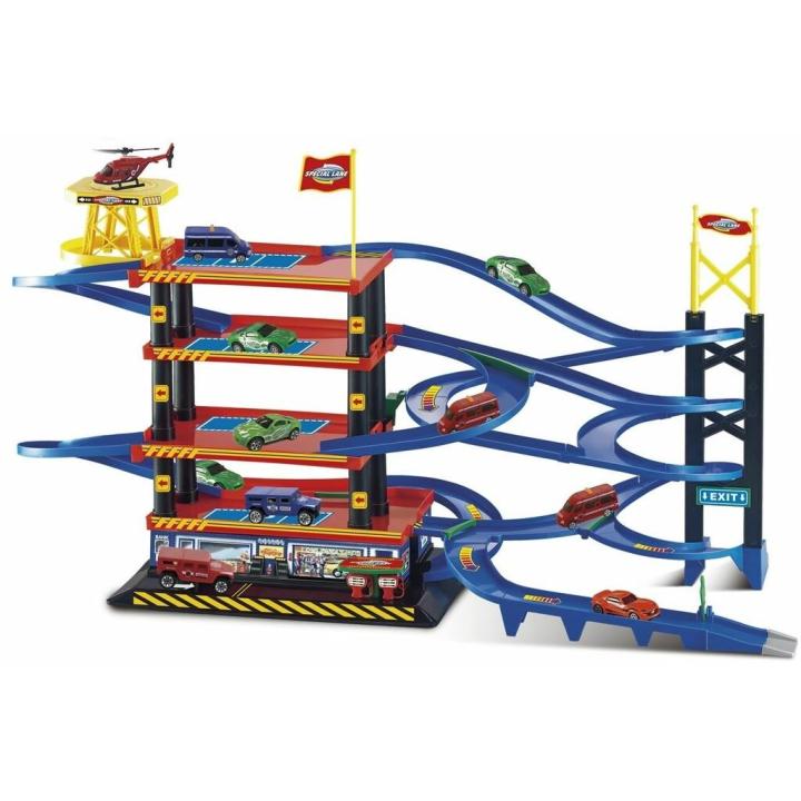 Incluye: 1 parking de 4 plantas con helipuerto, aparcamientos, rampas con cruces, taller y gasolinera, 1 helicóptero, 1 coche de rescate rojo, 1 coche de rescate azul, 1 furgoneta de rescate roja, 1 coche verde y 1 coche naranja.