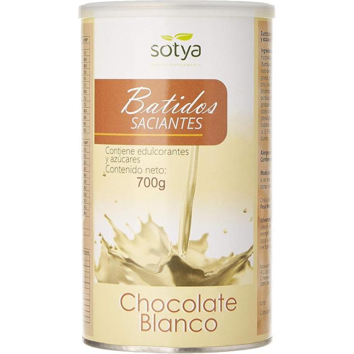 Batido Saciante (Sabor Chocolate Blanco) de Sotya es un complemento dietético diseñado, bien como sustitutivo de una comida. Estos batidos contienen un 25% de proteínas procedentes de la leche, vitaminas y minerales, bien como aporte adicional de nutrientes en estados carenciales o para personas con necesidades nutricionales mayores.