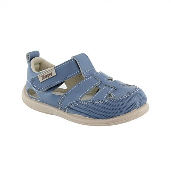 Sandalias cerradas de la marca ZapyFlex, modelo de 2 tiras de color azúl Niquel. Este calzado es respetuoso con el crecimiento y desarrollo natural de los pies. Se ajustan perfectamente a ellos gracias a su cierre con velcro.