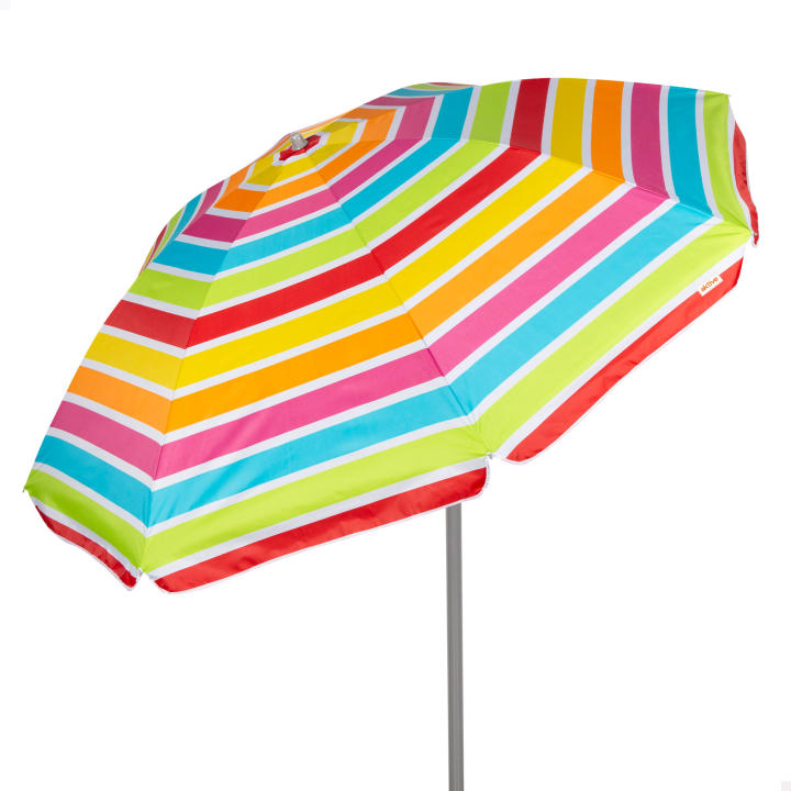 Descubre la sombrilla de playa definitiva pensada para ofrecerte el máximo confort. Presenta un diseño llamativo a rayas multicolor. Está fabricada con tejido de poliéster Oxford de alta calidad y mástil de acero resistente, con terminación en pica para clavarlo fácilmente a la arena. Su gran tamaño de 200 cm proporciona suficiente sombra para tu espacio personal, mientras que su tejido con revestimiento plateado y factor UV50 asegura una mayor protección contra los rayos del sol. Gracias a su mástil regulable en altura y reclinable, que permite orientar la sombrilla según la posición del sol, esta sombrilla se adapta a tus necesidades protegiéndote del sol en todo momento. Además, incorpora 8 varillas para mayor resistencia. La sombrilla viene con una funda con asa de hombro incluida para facilitar su almacenamiento y transporte.