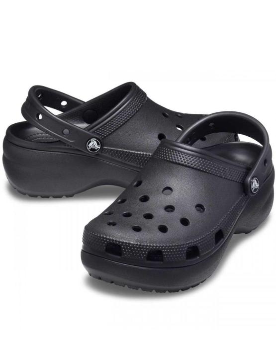 Los Zuecos Crocs Classic Platform Clog Negros son una versión elevada y moderna de los clásicos zuecos de Crocs. Mantienen todo el confort y funcionalidad característicos de la marca, pero ahora con un estilo distintivo gracias a su suela de plataforma que les otorga un look contemporáneo y a la moda.