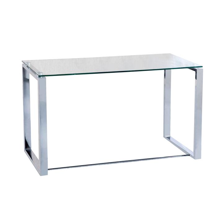 La mesa de escritorio Benetto XL presenta estructura en acero de color cromado o roble, con topes de plástico para no rayar el suelo y un refuerzo inferior para otorgarle mayor estabilidad al conjunto. El tablero, por su parte, es de cristal templado transparente de 8mm de grosor y está fijado a la estructura mediante círculos de acero termoadhesivo para evitar cualquier clase de accidente. Una amplia mesa de escritorio tan bella y elegante como práctica y funcional, de fácil limpieza y muy resistente. Si te interesa, también está disponible en tamaño estándar.