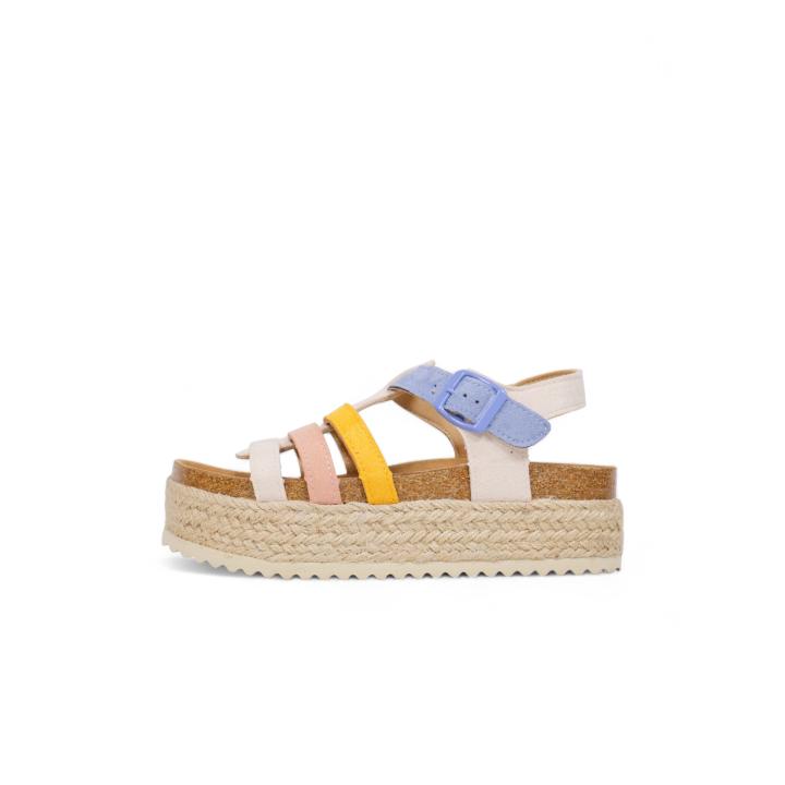 Preciosas sandalias planas con plataforma con efecto esparto. Tiene un diseño de tiras cubiertas en colores beige Rosa amarillo y azul. Combinable con casi todo por los colores, son perfectas para el uso diario. Muy cómodas y ligeras.