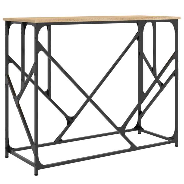 Añade un toque de elegancia a la entrada, el salón o el pasillo con esta elegante mesa consola. Material duradero: La madera de ingeniería tiene una calidad excepcional, con una superficie lisa, y también se caracteriza por su fuerza, estabilidad y resistencia a la humedad. Hecha de madera de ingeniería, la mesita de sofá es fácil de limpiar.Tablero resistente: El robusto tablero de la mesa de recibidor es perfecto para colocar fotos enmarcadas, macetas y otros objetos decorativos.Patas ajustables: Cuatro patas ajustables con almohadillas de plástico mantienen la mesa del pasillo equilibrada en terrenos irregulares y aumentan la estabilidad.Estructura metálica: La estructura metálica añade un estilo industrial a la casa, además de garantizar su durabilidad y estabilidad. Advertencia:Para evitar que vuelque, este producto debe usarse con el dispositivo de fijación a la pared incluido.