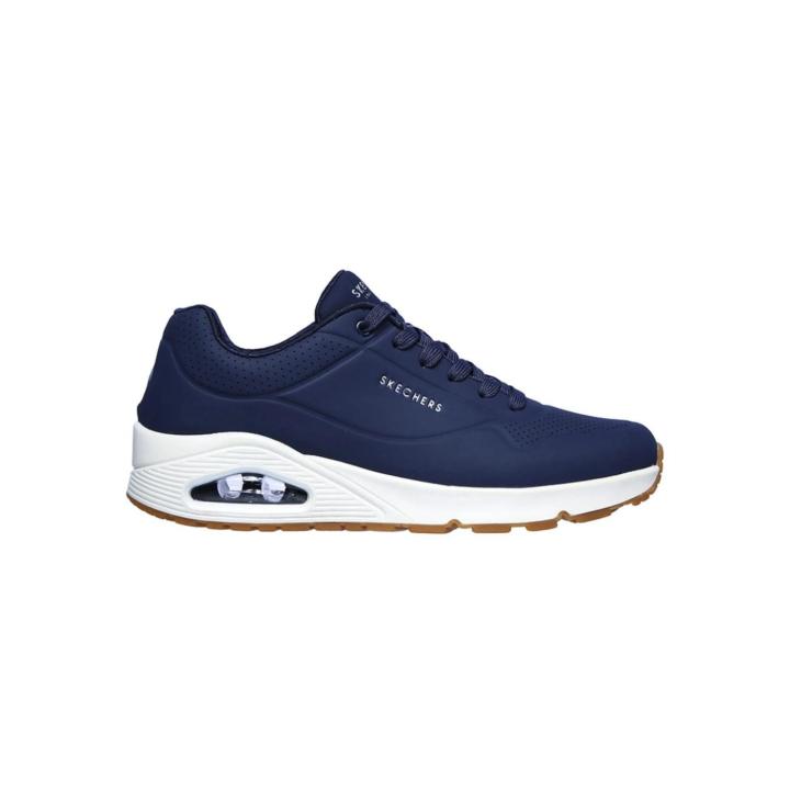 La comodidad clásica con cámara de aire se encuentra con una nueva actualización en la Skechers Street Street Uno - Stand on Air. Moderna zapatilla con cordones con parte superior de piel sintética lisa y perforada, una plantilla SKECHERS Air Cooled Memory Foam y media suela con cámara de aire visible Skech-Air.