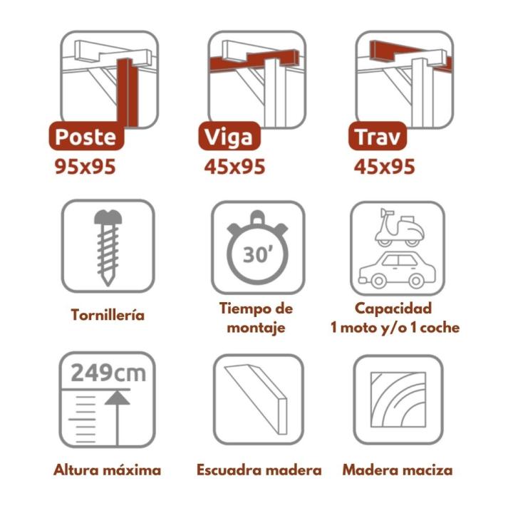 La cochera puedes situarla en cualquier parte de tu jardín o patio, con una capacidad de un vehículo y/o moto. Con unas medidas más que satisfactorias, tanto de largo como de ancho que te permitirá introducir cualquier tipo de vehículo sin importar el tamaño, debido a las grandes medidas que contiene este producto. Éstas medidas la puedes observar de manera más detallada en la parte inferior de ésta página.