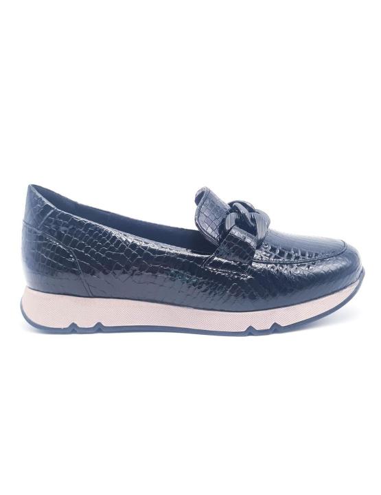 Zapato estilo mocasín para mujer, de la marca Doctor Cutillas en color negro. Elaborado en piel de de primera calidad, con un diseño grabado y acharolado ideal para dar luz a cualquier outfit. Calce práctico con detalle de cadena metálica al tono en el empeine. Plantilla ultraconfortable, con nombre de la marca grabado y suela de goma antideslizante, con puntera levantada para mejorar la pisada. Estilo de zapato de lo más cómodo, que aportará a tu pie un bienestar único al caminar.
