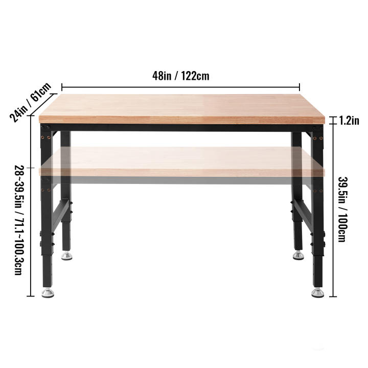 • Banco de trabajo de altura ajustable: el tamaño de la mesa de trabajo es de 48x24x39,5 pulgadas (1219x610x1003mm ± 3mm). El rango de ajuste de altura es de 28-39,5 pulgadas (711-1003mm ± 3mm). Hay 10 orificios de ajuste de altura, lo que le permite ajustar la Mesa a la altura adecuada manualmente sin esfuerzo y sin herramientas.
