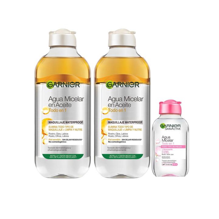 Garnier Skin Active Agua Micelar en Aceite, una tecnología utilizada en los productos farmacéuticos que combina la Eficacia de las micelas con el Aceite de Argán, capturando las impurezas y el maquillaje más resistente, waterproof sin frotar.