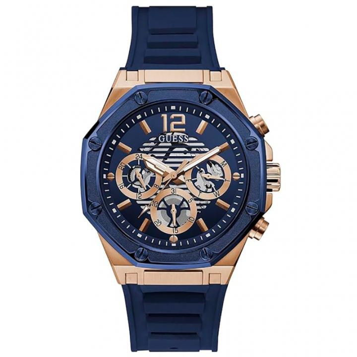 El reloj Guess GW0263G2 pertenece a la colección Momentum y está diseñado para hombres. Cuenta con una caja de acero inoxidable dorado de 44 mm, correa de silicona azul, y cristal mineral. Su mecanismo es de cuarzo y ofrece funcionalidad multifuncional, incluyendo visualización analógica con tres manecillas y subesferas para la fecha y hora en formato de 24 horas. Tiene resistencia al agua de 50 metros, lo que lo hace adecuado para uso diario, y viene con un estuche oficial y garantía