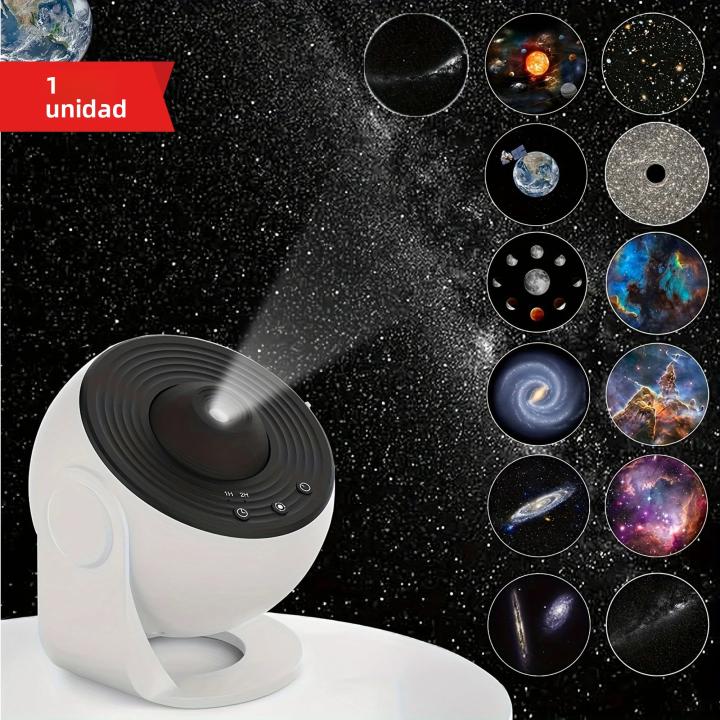 Transforma tu dormitorio en una noche estrellada con el proyector Galaxy, completo con 13 discos reemplazables para infinitas aventuras contemplando las estrellas.