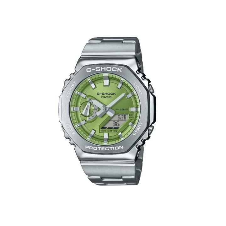 El G-SHOCK GM-2110D-3A conserva la esencia del diseño octogonal clásico con un impactante bisel metálico verde que lo hace destacar. Combina robustez y elegancia con una estructura metálica refinada, ideal para quienes quieren un reloj funcional, resistente y con una estética contemporánea y atrevida. Perfecto para llevarlo tanto en el día a día como en ocasiones especiales.
