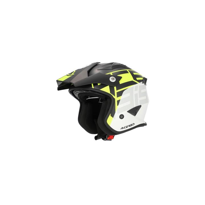 Casco tipo Jet concebido para combinar el estilo Trial con el uso urbano gracias a su diseño adaptable con visor solar y visera superior totalmente regulable y desmontable. La calota exterior está fabricada en resina termoplástica muy ligera y calota interior en EPS de dos tamaños para un mejor ajuste. Además, cuenta con un sistema de ventilación muy eficaz con entradas de aire regulables.