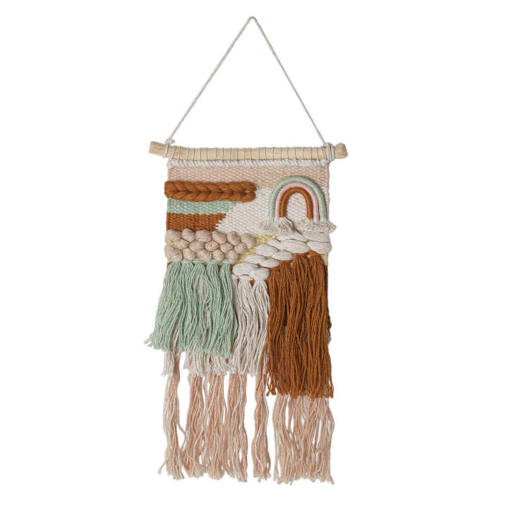 El tapiz de pared JOLLY de 30x65 quedará perfecto sobre la cama de tu peque. Está fabricado artesanalmente con hilos de yute natural, formando un original arcoíris con tonos pastel. Los colores rosa, azul y verde rompen sobre el fondo beige.