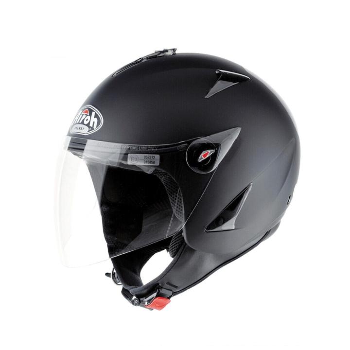 Casco jet AIROH enfocado en desplazamientos urbanos. Ligero y práctico su transporte se hace cómodo y viable en bolsas y baules. Trae visera incorporada para facilitar la conducción los días de lluvia y viento. Características principales: Calota fabricada en termoplástico Visera transparente con tratamiento antirayaduras Estructura interna del casco anatómico Anillo de gancho antirrobo Inte