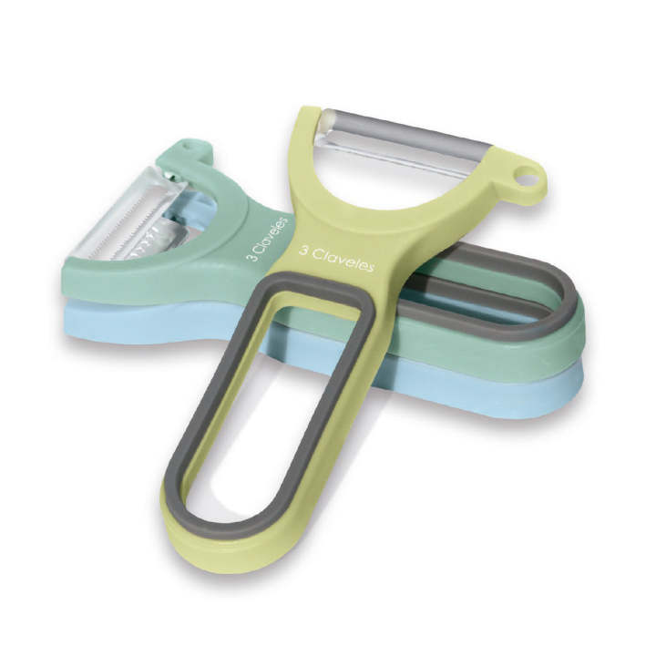 Set de 3 peladores 3 Claveles fabricado en acero inoxidable con mango ergonómico soft. Ideal para pelar frutas y verduras alargadas de manera extrafina. Apto para lavavajillas.