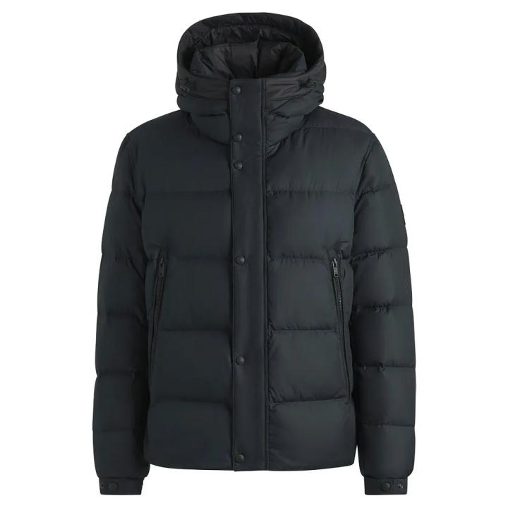 Chaqueta acolchada básica de alta tecnología / Nailon ligero mate / Tapeta central delantera con botones a presión expuestos / Capucha integrada con dobladillo en forro brillante a contraste / Bolsillos laterales con cremallera / Puños ajustables.