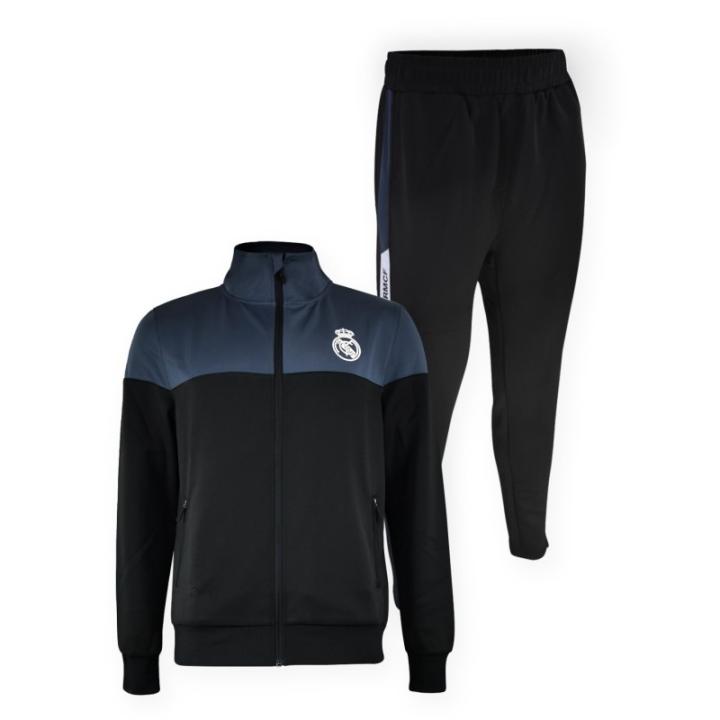 Conjunto de dos piezas poliéster del Real Madrid. Chaqueta negra y gris con el escudo del club en blanco. Puños y cintura elásticos, cuello alto y cierre con cremallera frontal completa. Dos bolsillos con cierre de cremallera. Mangas chaqueta con franja lateral en azul. Cintura elástica con cordones, dos bolsillos laterales y bajos con cremalleras.