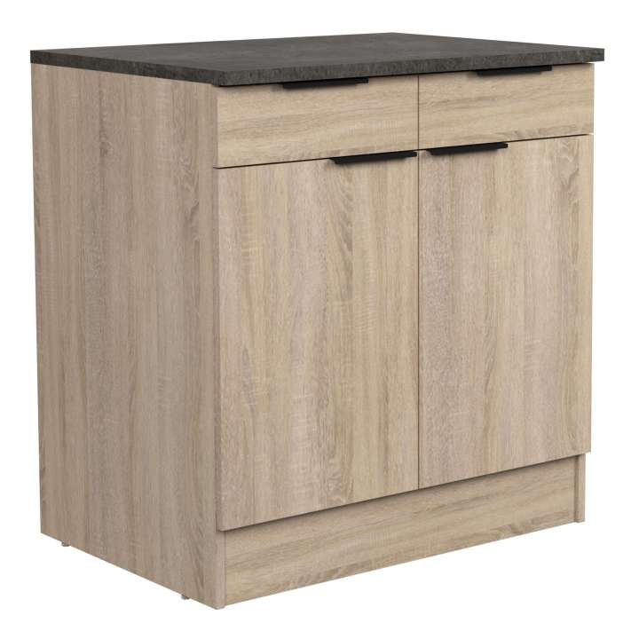 El módulo de cocina Arko presenta un contraste de roble áspero y negro que aporta un toque moderno y atractivo a la cocina. Su estilo contemporáneo transforma el espacio, generando un impacto visual dinámico y elegante, que llena de carácter y modernidad cualquier ambiente. Los tiradores de aluminio lacado en negro complementan su diseño, añadiendo un detalle único que realza su presencia decorativa, convirtiéndolo en el centro de atención en tu cocina. Fabricado en melamina, un material ideal para muebles gracias a su mayor resistencia comparada con otros materiales y su acabado atractivo. Este módulo de cocina incluye un cajón con guías de rodillos y rodamientos de bolas para una apertura suave, dos puertas que esconden un estante práctico para organizar tu despensa y utensilios de cocina de manera eficiente. No pierdas la oportunidad de optimizar tu espacio de almacenamiento con este versátil módulo. ¡Compra ahora y disfruta de sus ventajas técnicas! Medidas: Medidas: Ancho: 80 cm, Alto: 86 cm, Profundidad: 60 cm. Se trata de mobiliario con kit de montaje, que incluye manual de instrucciones y tornillería.No se garantizan envíos a Menorca, Ibiza y Formentera. Las entregas se realizan a pie de calle