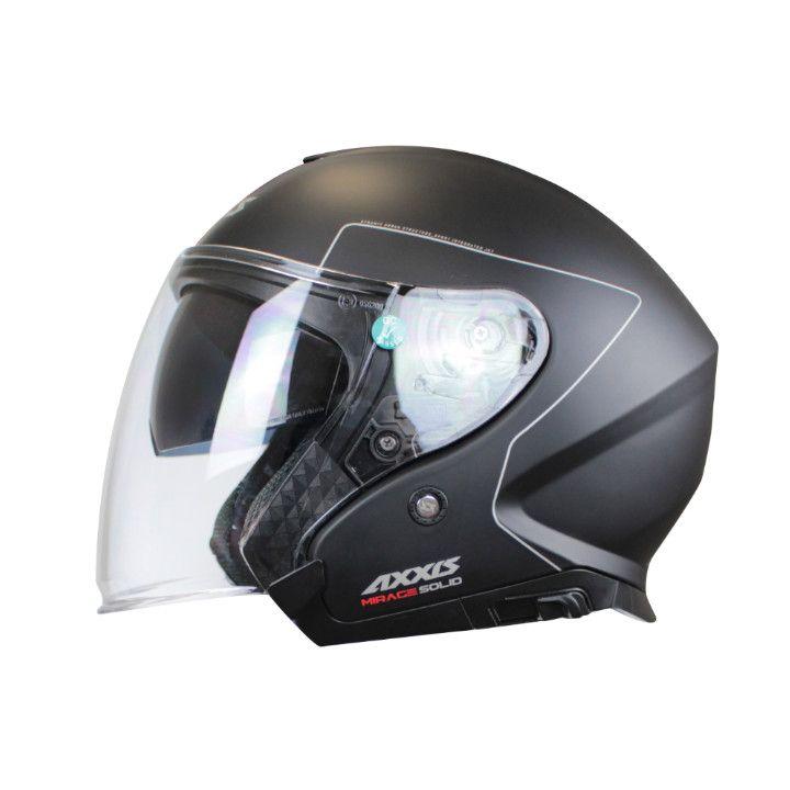 DETALLES DEL PRODUCTO Axxis Jet Mirage SV disponible con nuevo sistema de gafa solar. Guiado mediante cable lo que aporta una mayor suavidad. Perfecto ajuste de Pantalla. El mecanismo de la base la empuja contra el perfil de goma garantizando un sellado optimo. Terminada en un reborde que evita turbulencias. La mejor tecnología disponible actualmente en el mercado. Certificación ECE 22.05. Di