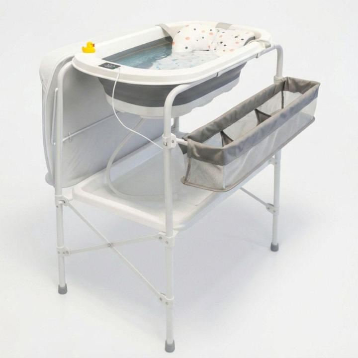 Haz del baño del bebé un momento cómodo, seguro y organizado con nuestra Bañera Plegable con Soporte, Cojín Reductor, Termómetro y Cambiador, en elegante combinación blanco y gris. Diseñada para adaptarse a cualquier hogar, esta solución 3 en 1 es ideal desde los primeros días de vida del bebé.
