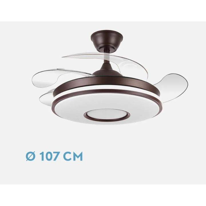 Ventilador DC serie DANI realizado en metal, policarbonato, en color MARRON-BLANCO con cuatro aspas DESPLEGABLES de ABS transparente muy resistentes. Tiene seis velocidades ajustables. Motor DC. Tecnología LED integrada con una potencia de 59W, con 3 TEMPERATURAS SELECCIONABLES DE LUZ (3000-4000-6000K) luz cálida, natural y blanco frío, y 6980 lúmenes. Control de aire verano o invierno. Su medida es de 34,5/42X50 centímetros con las aspas plegadas y de 34,5/42X107 centímetros con las aspas desplegadas. Incluye dos tijas de 12,5 y 20 centímetros, para instalar a distintas alturas. Mando a distancia INCLUIDO, REGULABLE EN INTENSIDAD, con MEMORIA DE COLOR incorporada y TEMPORIZADOR 2/4 H. Modelo disponible en color cuero, blanco, negro, marrón y níquel, además de en dos tamaños diferentes.