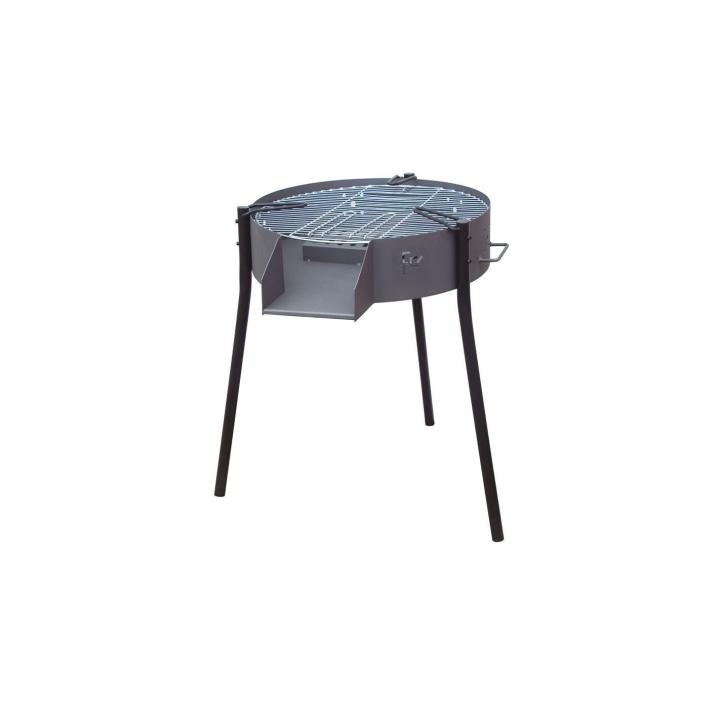 Fabricada en metal con pintura anticalórica, ofrece gran resistencia al calor y durabilidad. Incluye una parrilla metálica cincada homologada para cocinar de forma segura. Sus asas laterales permiten un fácil transporte, mientras que sus tres patas metálicas aseguran estabilidad en cualquier superficie.
