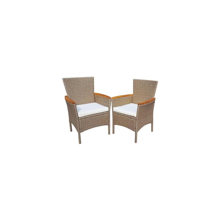 Este elegante juego de sillones está diseñado para ofrecer el máximo confort y durabilidad en espacios exteriores. Su estructura de acero con ratán sintético trenzado garantiza una gran resistencia a la intemperie, mientras que los reposabrazos de madera de acacia aportan un toque cálido y sofisticado. Además, incluye cojines de poliéster en color crema para un extra de comodidad.