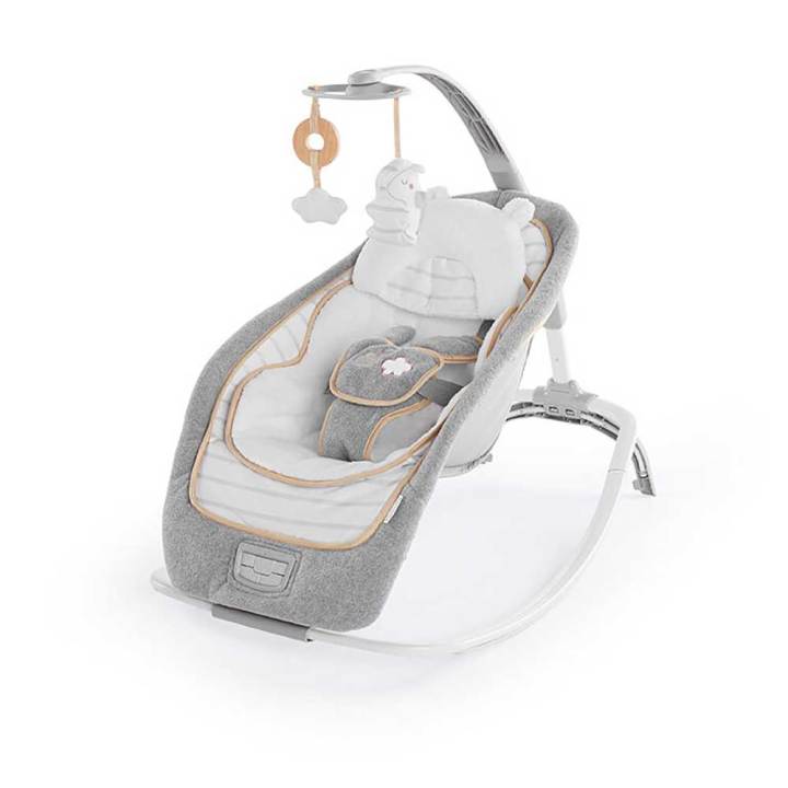 Cuenta con vibraciones relajantes y melodías suaves que ayudan a calmar al bebé, además de una barra de juguetes desmontable con adorables peluches que estimulan sus sentidos y desarrollo motor. Su estructura ofrece un balanceo natural y un modo fijo, adaptándose a diferentes momentos del día.