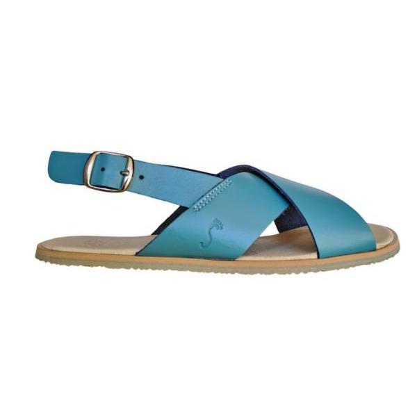 Están elaboradas en España con piel de gran suavidad en color azul agua, que resulta muy agradable al contacto con la piel. Cuentan con una suela delgada y flexible, y su sistema de cierre combina una hebilla permite un ajuste cómodo para diferentes tipos de pie.