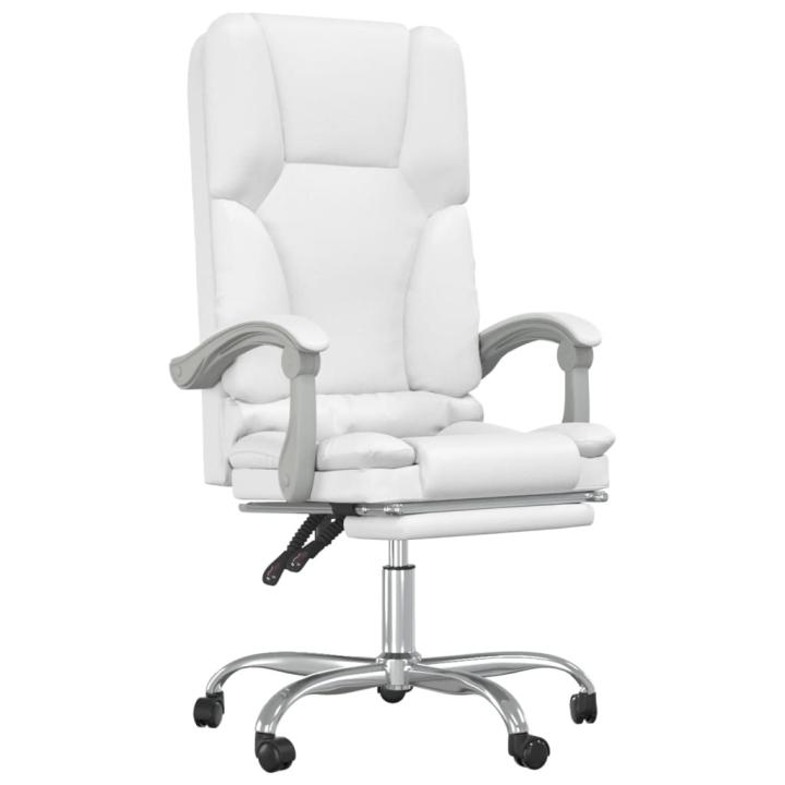 Con un diseño minimalista, esta moderna silla de oficina reclinable con función de masaje combina elegancia y comodidad, por lo que atraerá todas las miradas en tu espacio de trabajo. Material duradero: El cuero sintético de primera calidad es un material muy duradero. Es resistente a las manchas, por lo que es fácil de limpiar con un paño húmedo. Además, la superficie lisa da un aspecto lujoso y la belleza del cuero auténtico.Función de masaje: El punto de masaje en el respaldo calma la fatiga de forma eficaz y ayuda a que te relajes mientras trabajas.Respaldo y altura regulables: Está especialmente diseñado con una función reclinable para que puedas ajustar el respaldo y el reposapiés según prefieras. Utiliza la palanca para ajustar la altura del asiento a tu gusto.Diseño práctico: El diseño giratorio de 360 grados permite un amplio rango de movimientos. Además, resulta práctica de mover gracias a las ruedecitas.Estructura robusta y estable: Las estructuras de metal y madera contrachapada garantizan su solidez y estabilidad. Información útil:Cada producto viene con un manual de montaje en la caja para facilitar el montaje.El producto tiene un conector USB, pero no se incluye la fuente de alimentación USB de 5 V certificada.