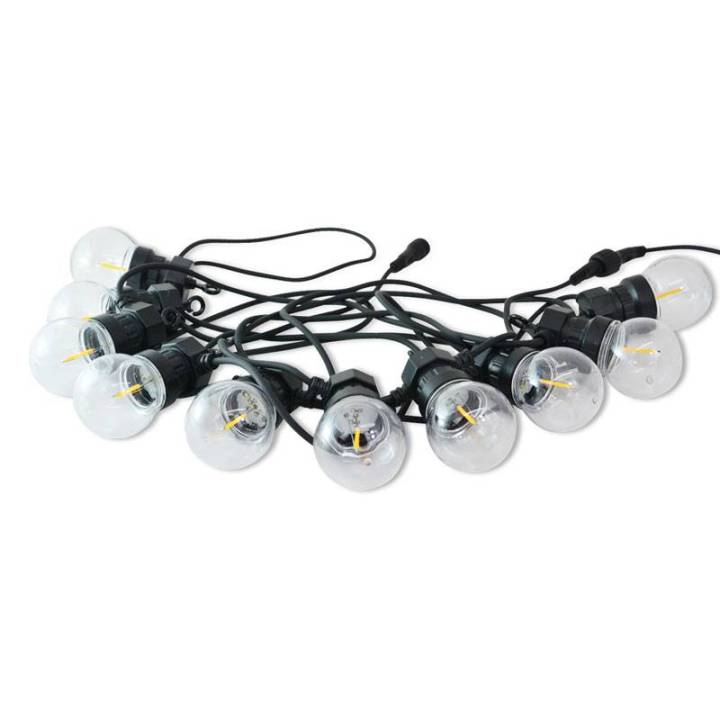 Guirnalda LED con una temperatura de color blanco cálido de 3000 grados Kelvin, ideal para crear un ambiente agradable y confortable. La Guirnalda LED tiene una forma compacta e integrada con 10 bombillas LED con una potencia de 2W, una intensidad lumínica de 400 lúmenes, con un ángulo de apertura del haz de luz de 360 grados. Grado de protección IP44 que la hace resistente a la humedad (no apta para exponer al agua ni a la lluvia). Cableado y casquillo negro.