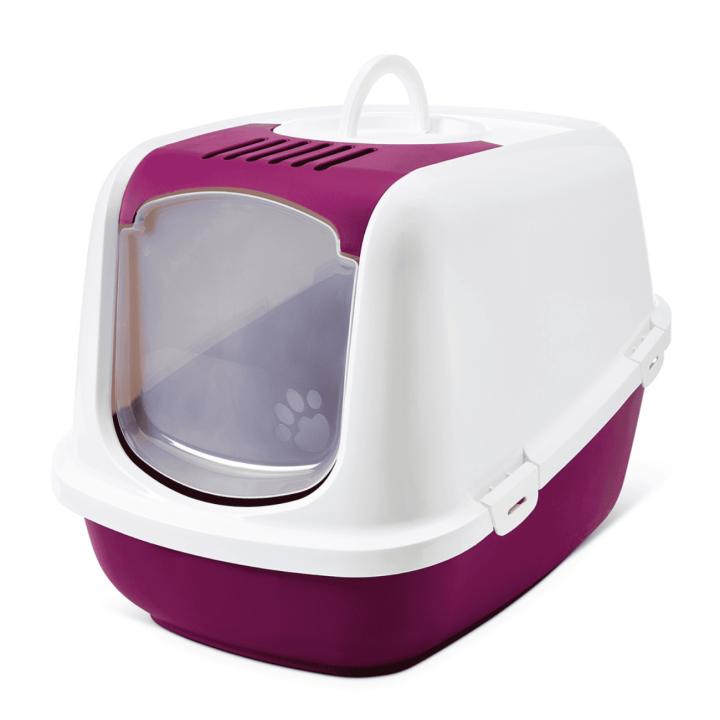• Puerta abatible de plástico transparente: Permite el acceso de gatos de mayor tamaño y ofrece la privacidad deseada, contribuyendo además a la contención de olores y arena.