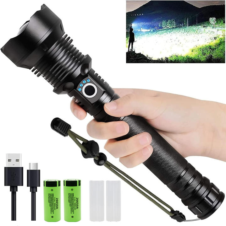 Linterna LED recargable de alta potencia, 2600 lúmenes, superbrillante, 3 modos, resistente al agua, potente linterna de mano para emergencias de camping.【BATERÍA DE ALTA CALIDAD Y PANTALLA DE POTENCIA】La linterna de alto lumen viene con una batería recargable de 2600 mAh de alta calidad que puede proporcionar hasta 12 horas de energía sin reducir el brillo. Además, la luz indicadora de energía LED de cuatro velocidades monitorea la energía restante de la linterna LED en tiempo real, y se carga y descarga a tiempo para garantizar la vida útil de la linterna.【Linterna USB recargable】Linterna recargable con puerto Tye C y cable USB, que se puede conectar a computadoras portátiles, enchufes de pared, cargadores de automóvil, bancos de energía y otros dispositivos con interfaces USB para cargar la linterna.【5 modos y cabezal ajustable】La potente linterna Lylting puede cambiar fácilmente 5 modos de iluminación (alto/medio-bajo/SOS/estroboscópico) con solo presionar el interruptor de iluminación, sin necesidad de recorrer todos los modos, mantenga presionado para apagarlo Todos los modos de luz. Tirando suavemente del cabezal de la linterna, puede cambiar fácilmente entre haz ancho y haz estrecho, mejorando enormemente la eficiencia del trabajo nocturno.【Construcción robusta y duradera】ElEl cuerpo de la linterna recargable de alta resistencia está hecho de aleación de aluminio 6063 de grado aeronáutico anodizado duro con tratamiento de anodizado duro, y el mango tiene rayas antideslizantes y diseño de cuerda de cola para un agarre seguro. La linterna LED recargable es muy potente y resistente al voltaje y no se dañará incluso si un camión se presiona contra la carrocería.【Impermeable y versátil】Con un diseño resistente al agua IPX7, esta linterna duradera puede soportar condiciones climáticas extremas y es perfecta para uso en interiores y exteriores, como acampar, hacer senderismo, pescar, pasear perros, cortes de energía, uso doméstico o iluminación de emergencia.El paquete incluye:2x caja de cartón corrugado2 baterías de litio 266501 x cable de carga USB,1 x cable de linterna,1 manual de usuario en inglés.