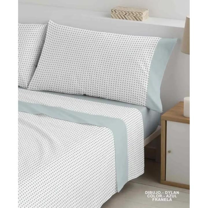 Juego de sábanas de franela Dylan, en color azul, de la marca Polo Polo. Juego de cama de invierno en tejido de algodón, compuesto por una sábana encimera estampada con dibujos de rayas en tonos verdes sobre fondo blanco, una funda de almohada con el mismo estampado que la encimera y una sábana bajera ajustable en color verde liso. Embozos en la sábana encimera y en las fundas de almohada a juego con la bajera. Máximo confort, tejido muy suave y confortable, tacto afranelado, alta resistencia a los lavados.