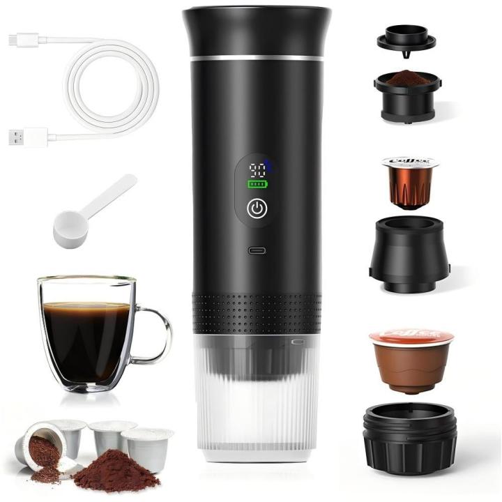 Cafetera eléctrica portátil inalámbrica para coche y camping, con depósito de agua de 80 ml, pantalla digital, 3 en 1, para cápsulas de café en polvo y viajes.