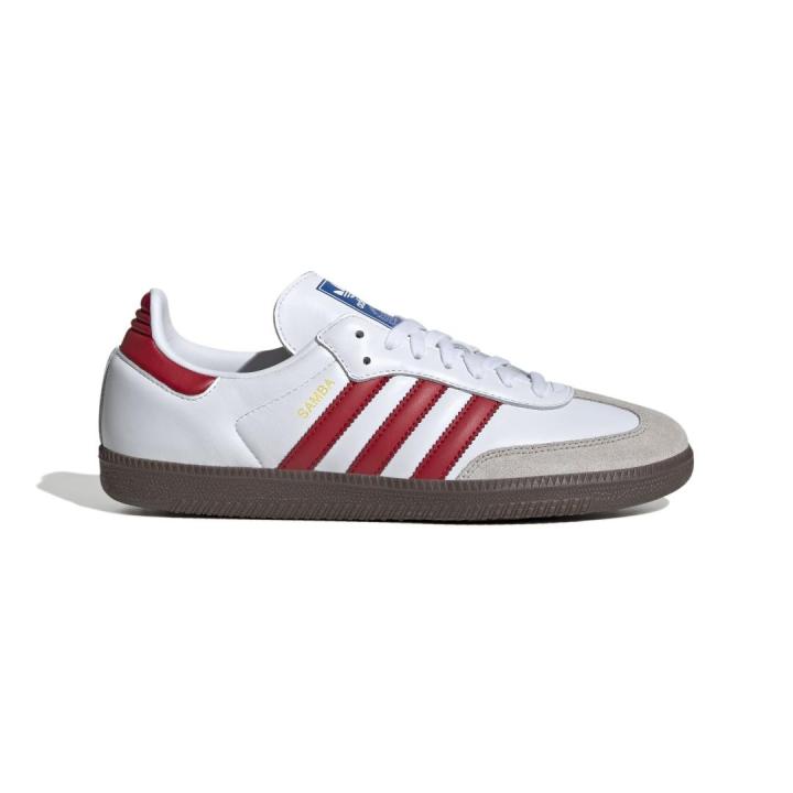 zapatillas Adidas Samba OG en la combinación de colores Cloud White / Better Scarlet / Gum (blanco con detalles escarlata y suela de goma color caramelo). Características principales Material exterior: Parte superior de piel plena flor (cuero) con superposiciones de ante en la puntera para resistir la abrasión. Suela: Emblemática suela de goma color caramelo (gum rubber cupsole) que proporciona un agarre óptimo. Revestimiento: Forro de piel sintética. Plantilla: Incluye una plantilla OrthoLite® para mayor comodidad y control de la temperatura del pie. Cierre: Sistema de cordones. Diseño: Silueta clásica de caña baja con detalles en relieve dorado con el nombre 'Samba'. Uso: Originalmente diseñadas para el entrenamiento de fútbol en superficies heladas, se han convertido en un icono de la moda urbana versátil para el día a día.
